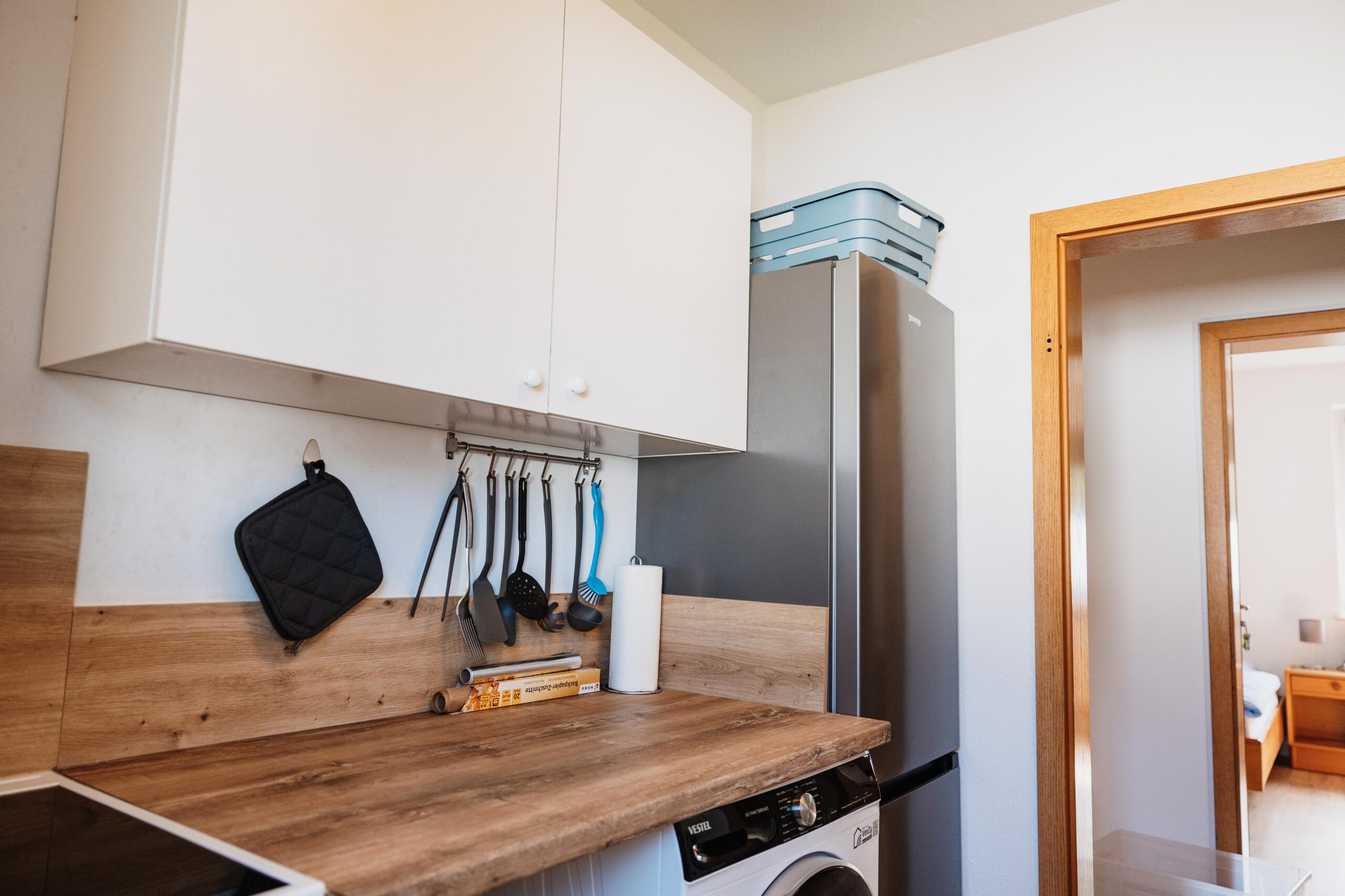 L'appartement dispose d'une salle de bain commune avec douche, lavabo et WC. Dans la cuisine entièrement équipée, vous trouverez tout ce dont vous avez besoin pour cuisiner, une cuisinière électrique avec four, un lave-vaisselle, un réfrigérateur, un congélateur, un four à micro-ondes, une cafetière, une bouilloire, un grille-pain et tous les ustensiles de cuisine essentiels.
